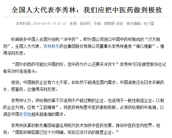 | 新聞報道“全國人大代表李秀林:我們應把中醫(yī)藥做到極致” |